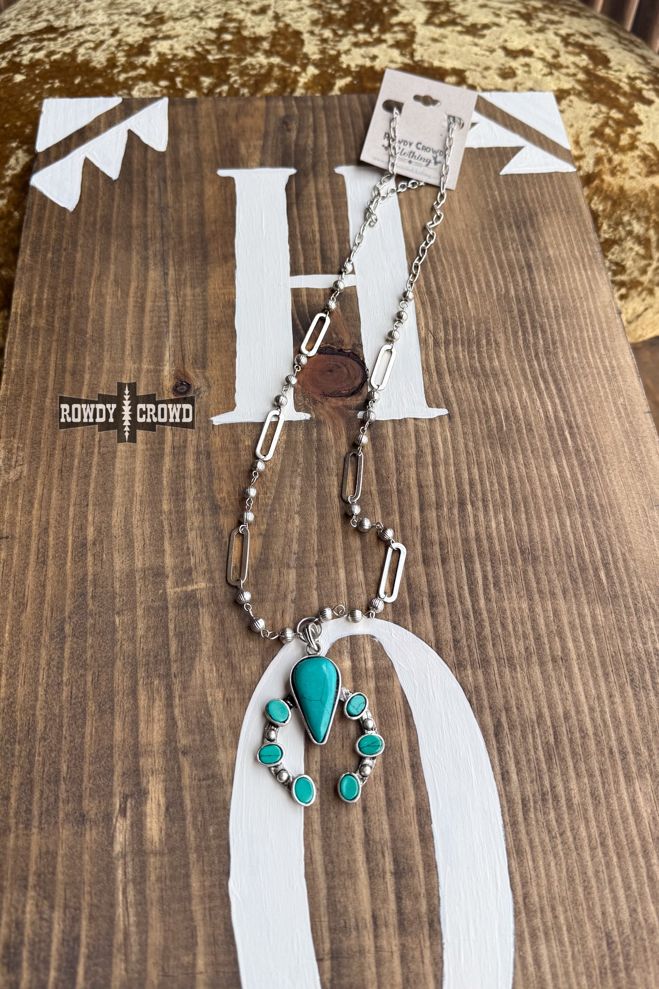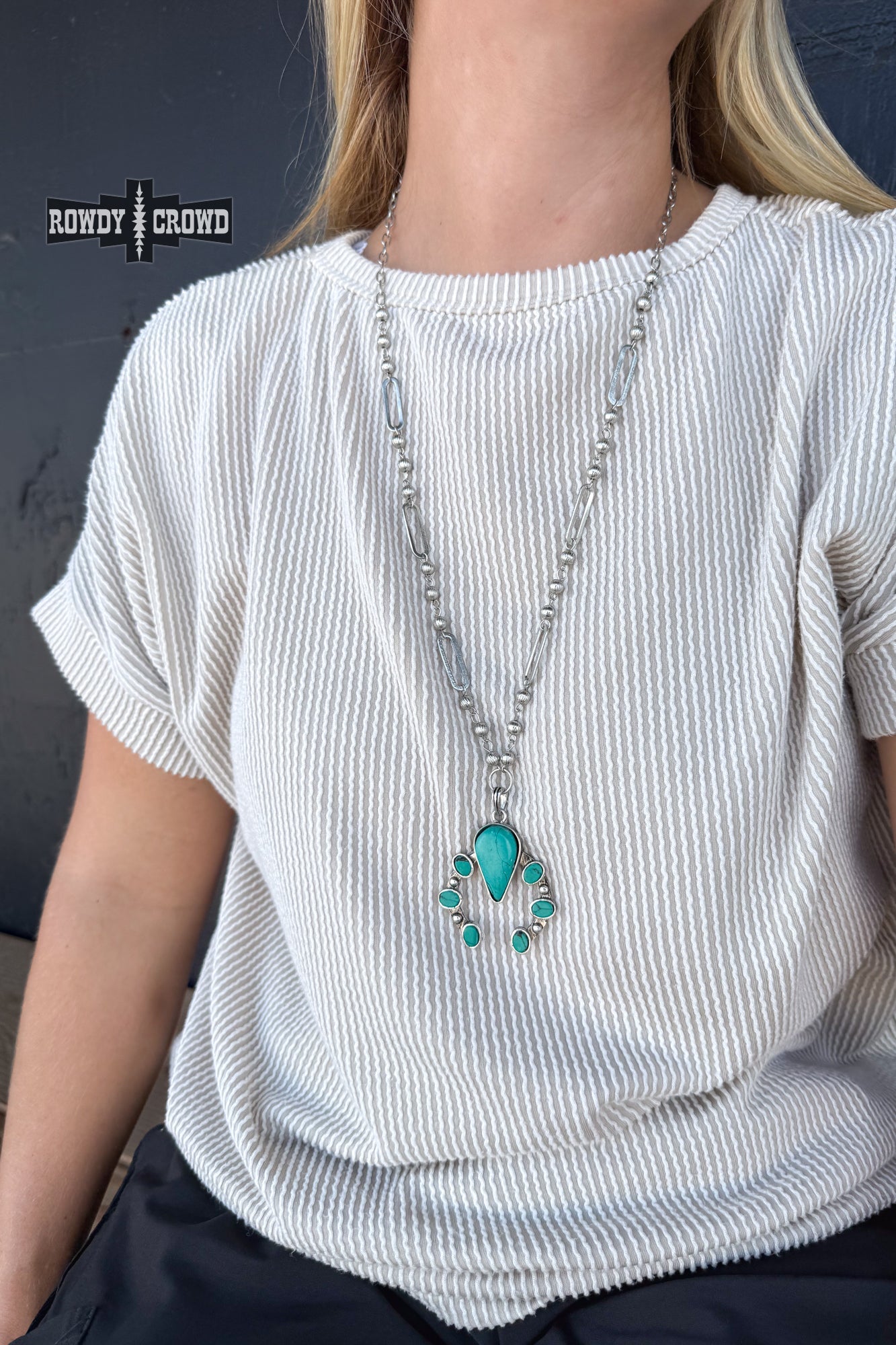 The Coyote Flats necklace is a turquoise squash blossom on an intricate silver chain. You can wear it alone or stack it with your favorite necklaces!